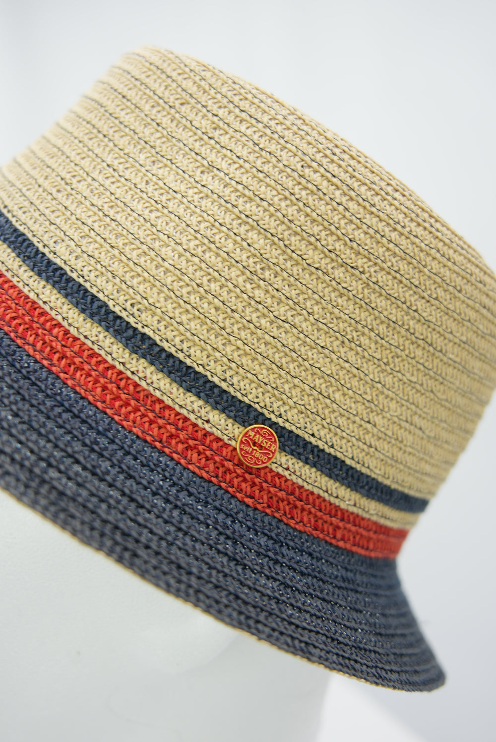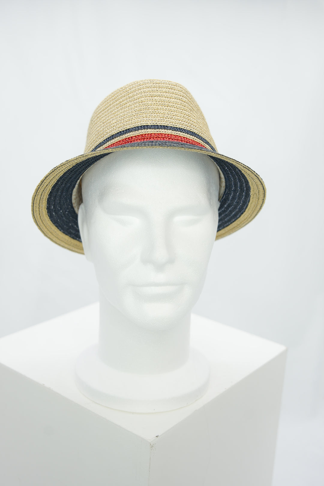 Strohhut mit dunkelblauer Krempe und rotem Akzent