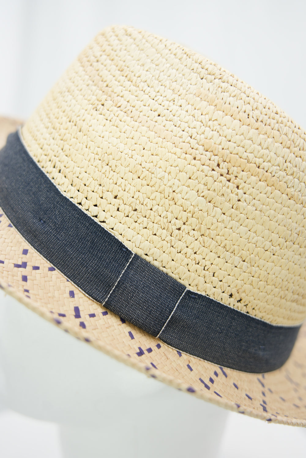 Panamahut mit lila Muster an der Krempe und Jeansband