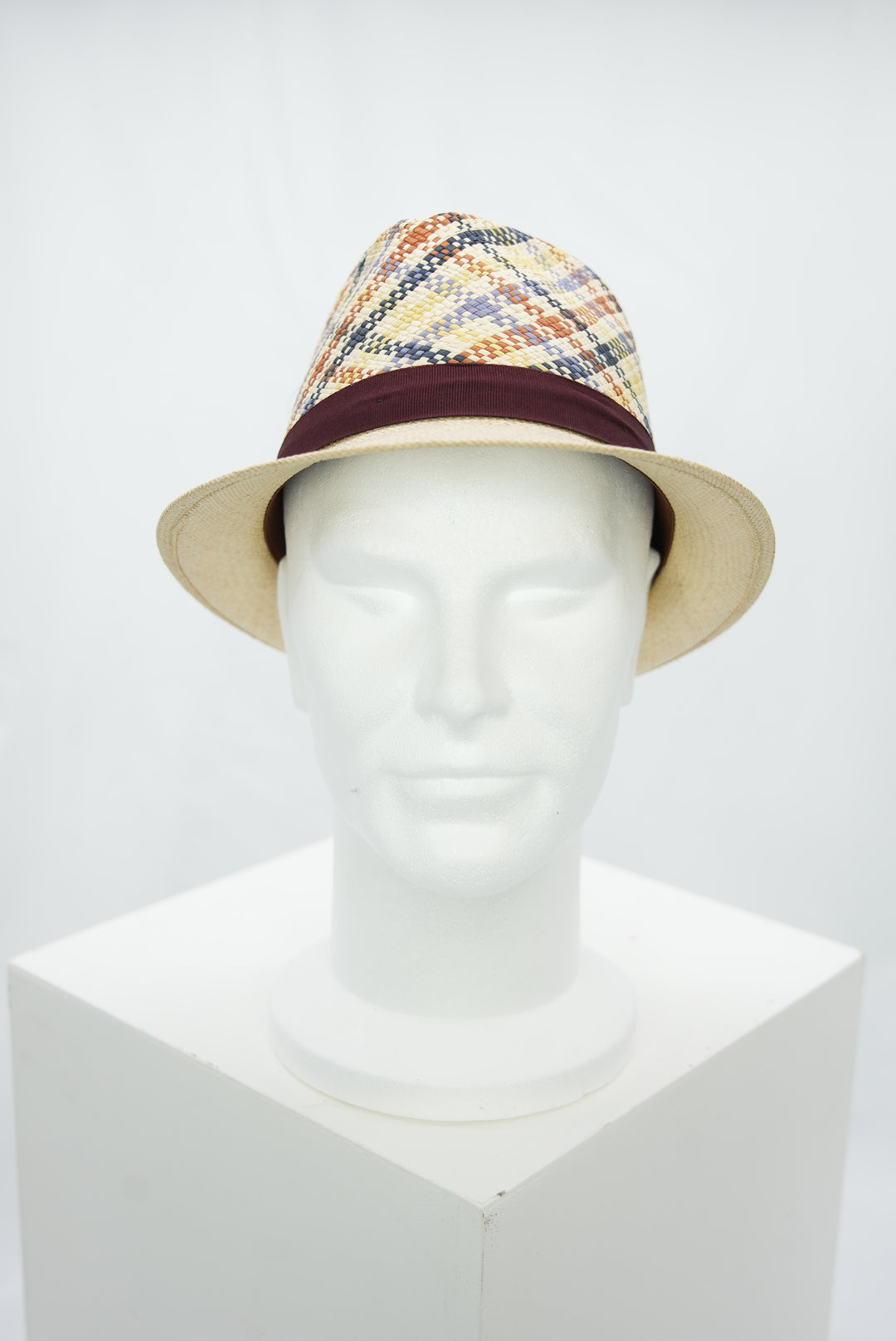 Panamahut mit gemusterter Hutkrone und dunkelrotem Band