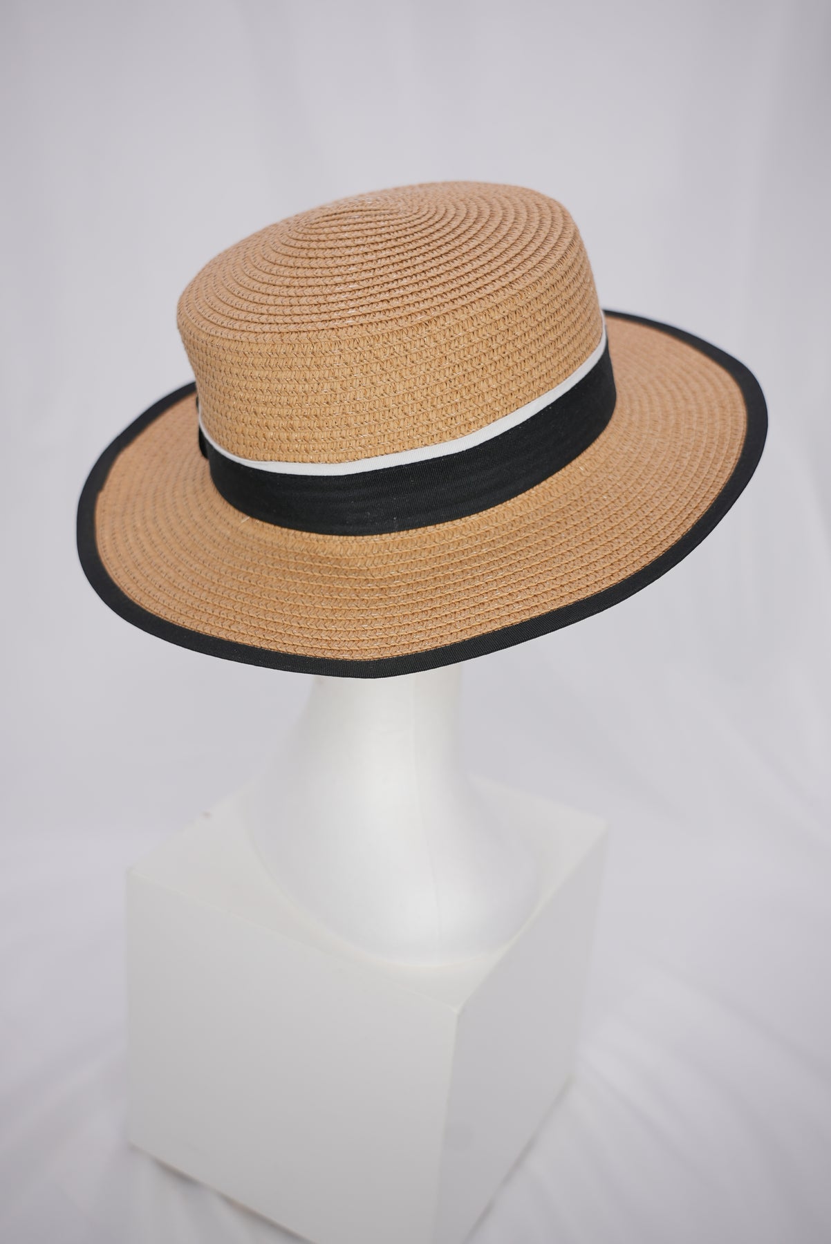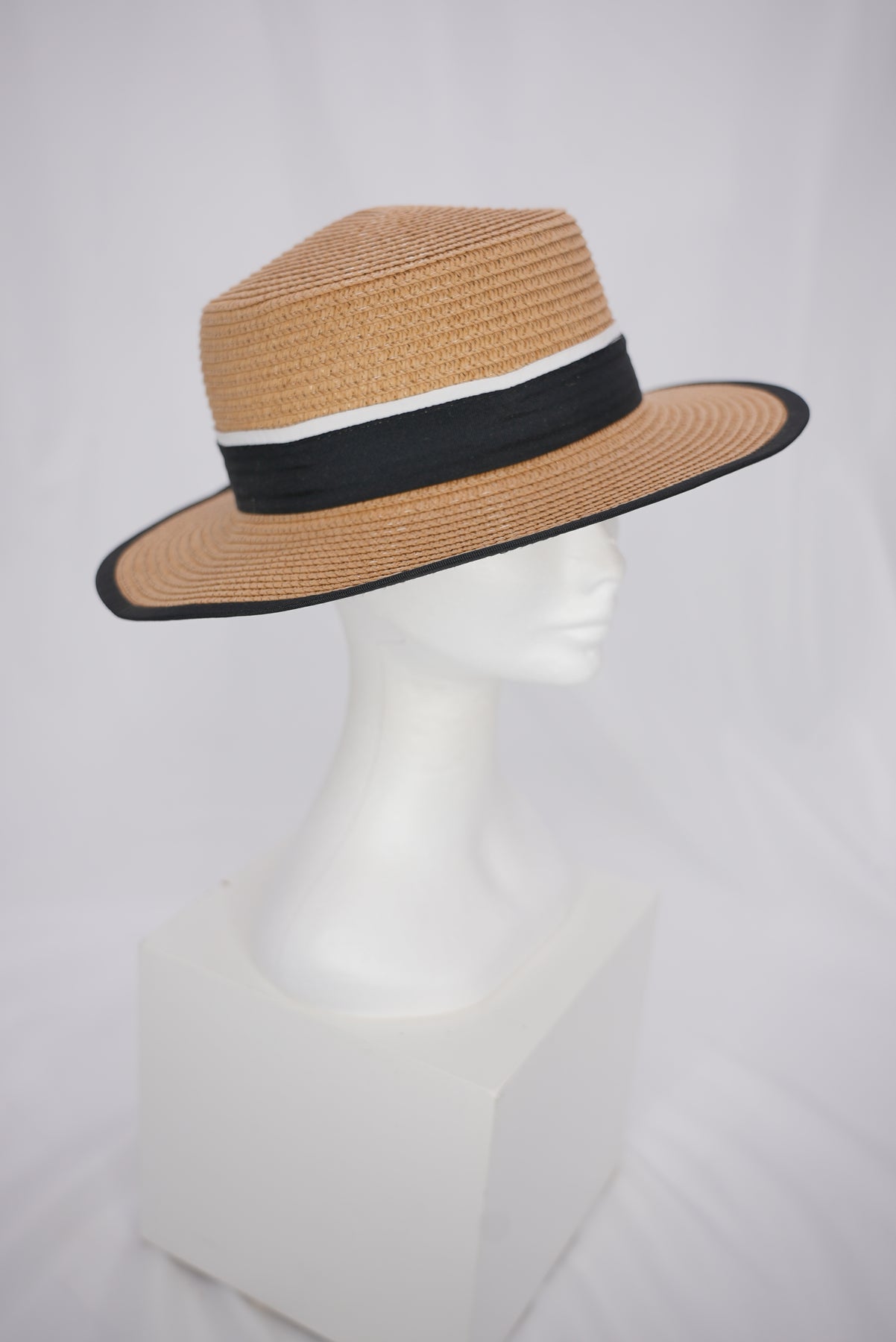 Der schwarze Rand setzt einen markanten, modernen Akzent und verleiht dem Hut eine klare Kontur. Ergänzt wird das Design durch ein stilvolles schwarz-weißes Band, das dem Look eine klassische, zugleich trendbewusste Note schenkt.