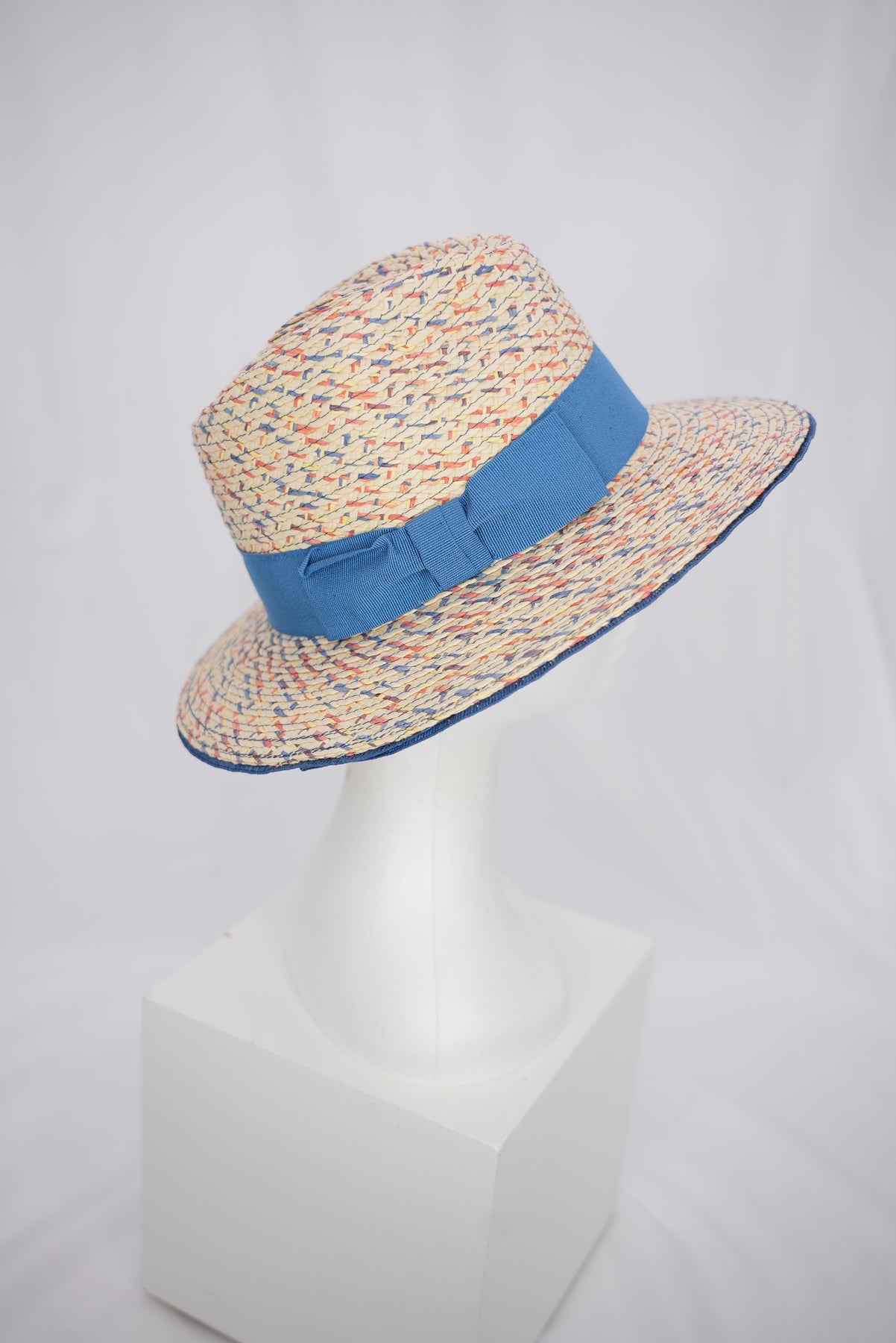 Ein kleiner blauer Rand an der Krempe setzt einen frischen Kontrast und betont die Form des Hutes auf elegante Weise. Zusätzlich umschließt ein blaues Band die Krone und bindet hinten eine zarte Schleife, die dem Design eine feminine, verspielte Note verleiht.