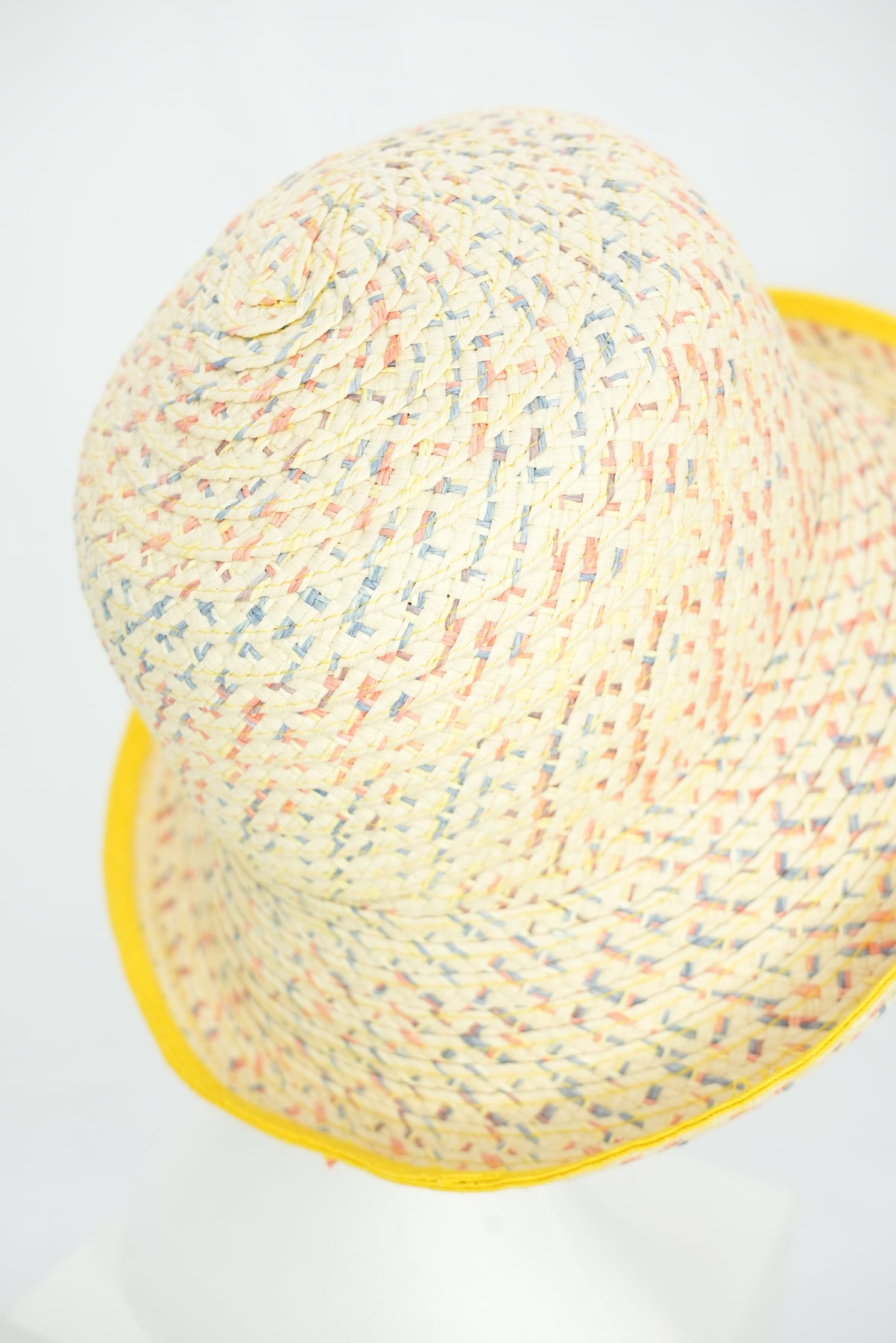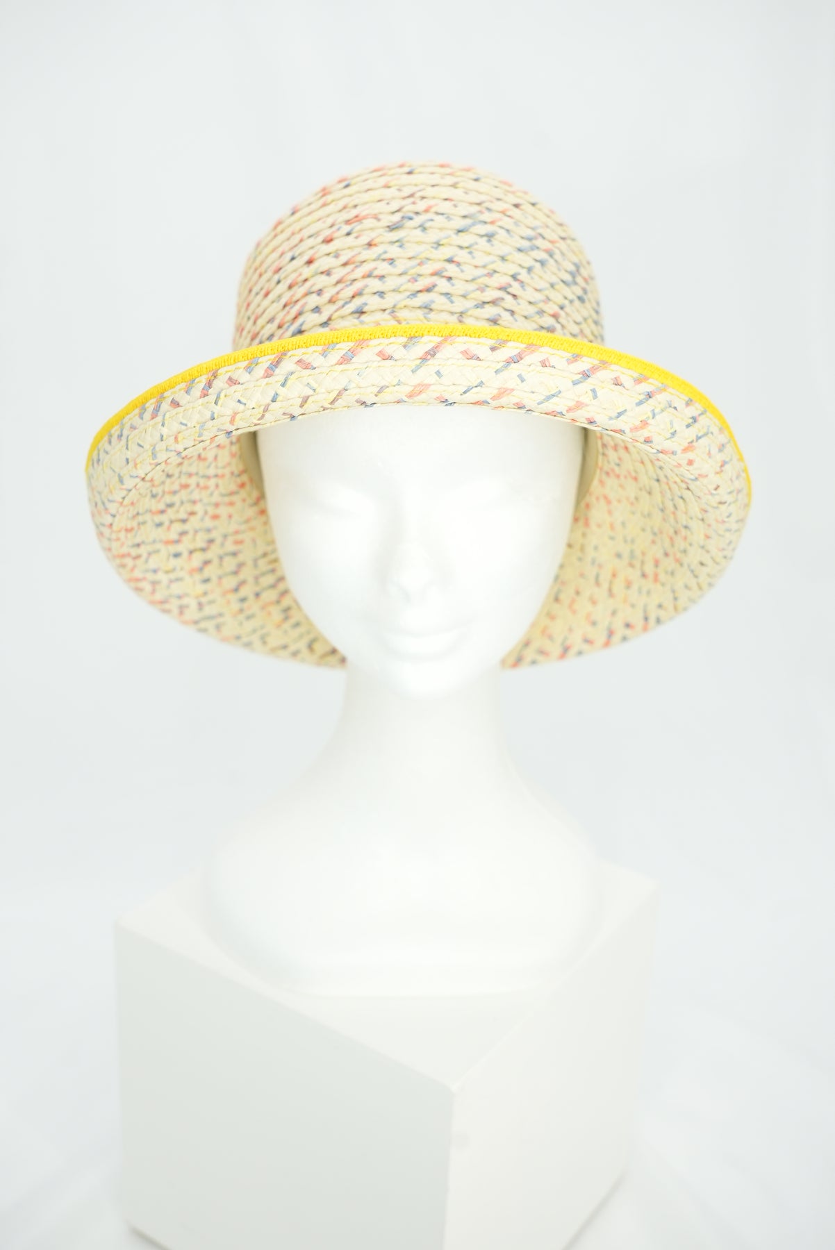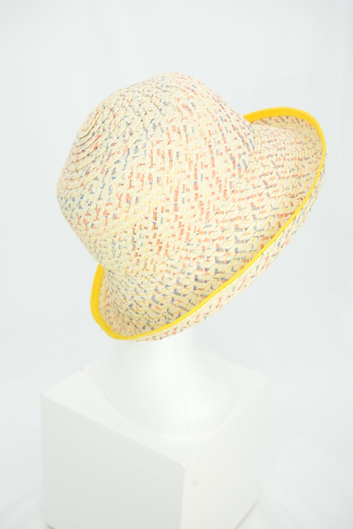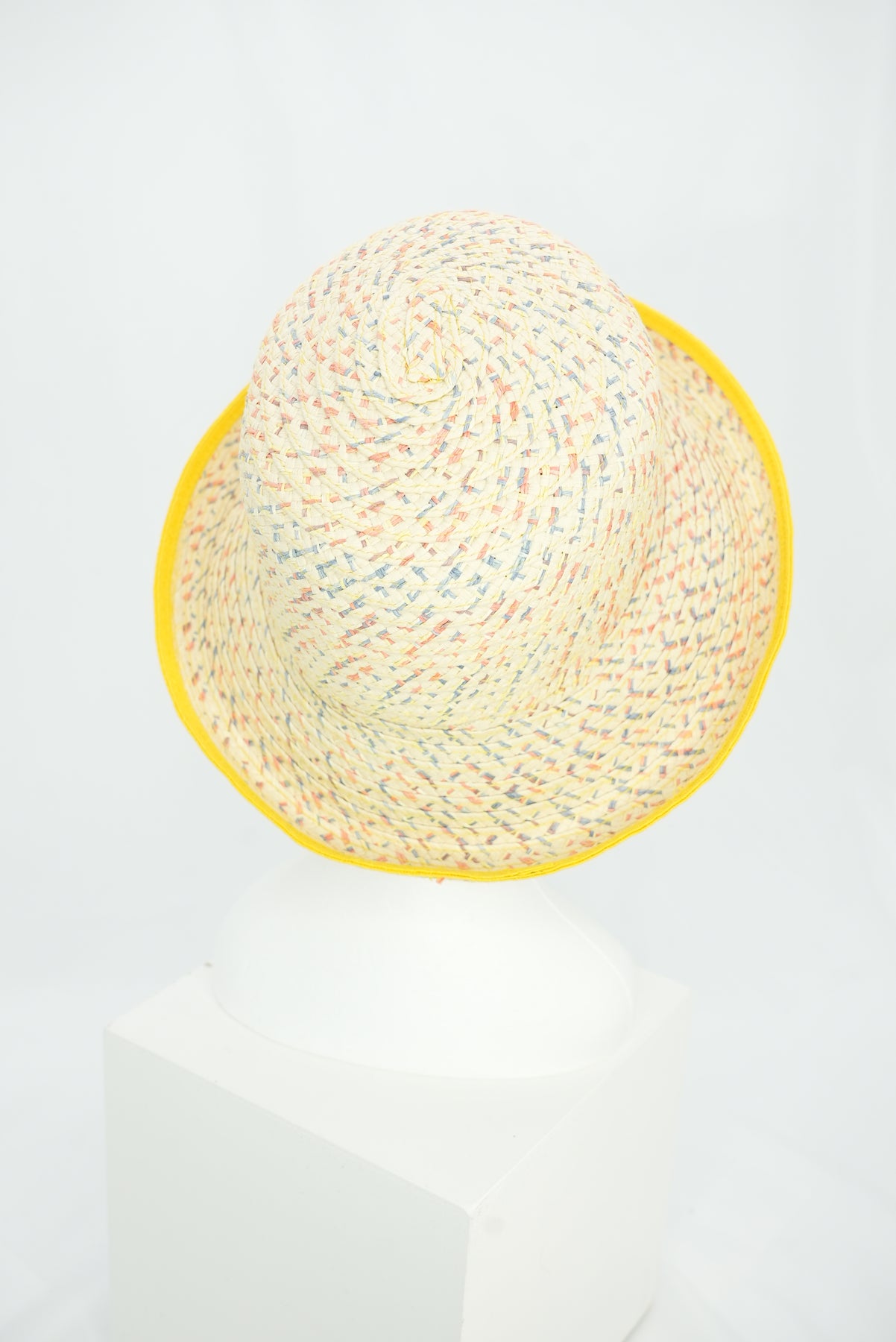 Ein besonderer Blickfang ist der gelb eingefasste Rand, der dem Hut eine frische, sonnige Note verleiht und das Gesamtbild stilvoll abrundet. Der farbige Abschluss setzt einen klaren Kontrast zum Naturton und sorgt für einen modernen, individuellen Touch.