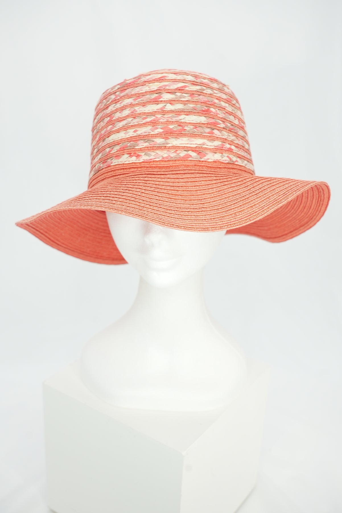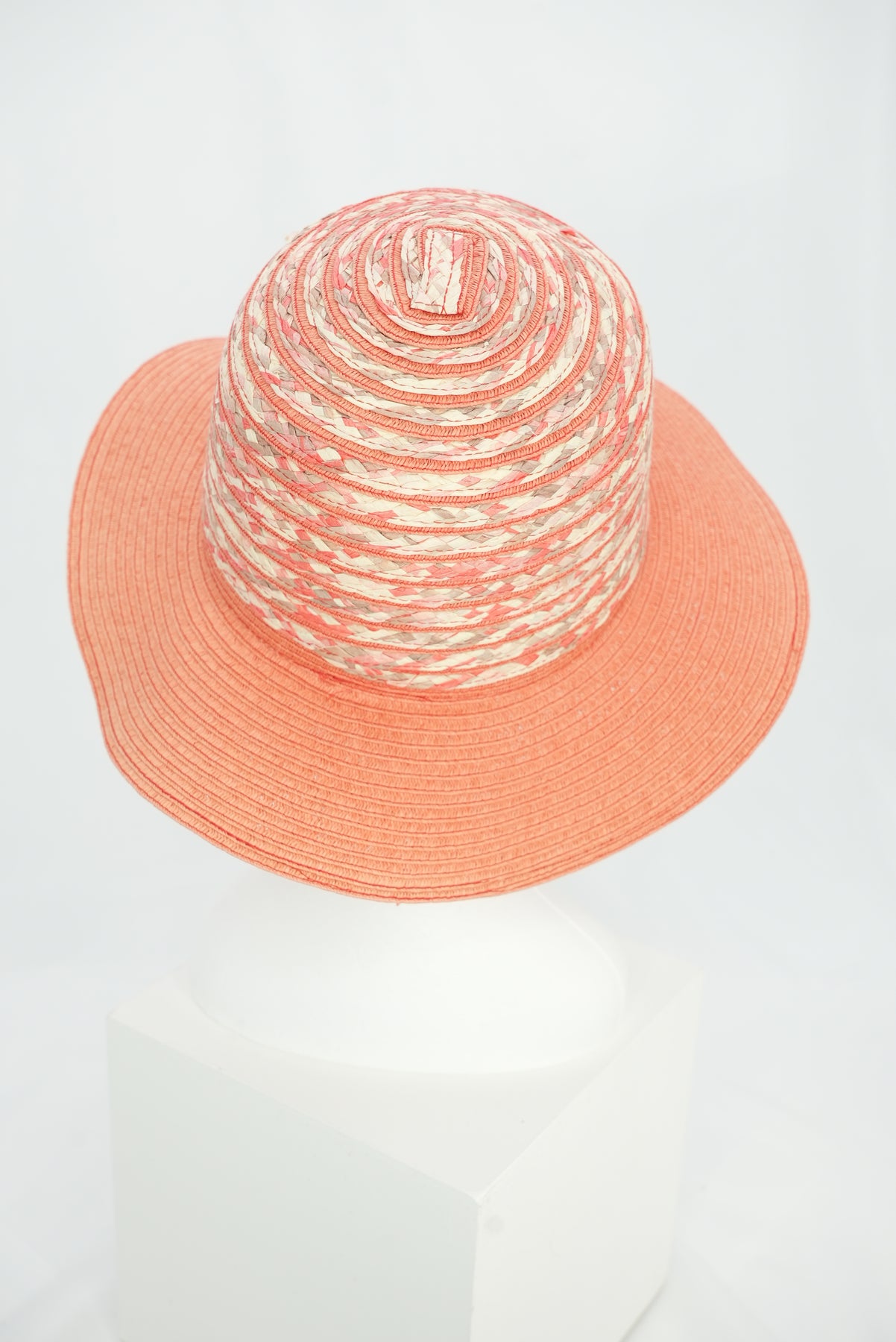 Die Hutkrone ist kunstvoll zweifarbig geflochten, was dem Modell eine besondere Struktur und Tiefe verleiht. Das Zusammenspiel der beiden Farben wirkt lebendig und zugleich stilvoll – ein echter Hingucker, ohne aufdringlich zu sein.