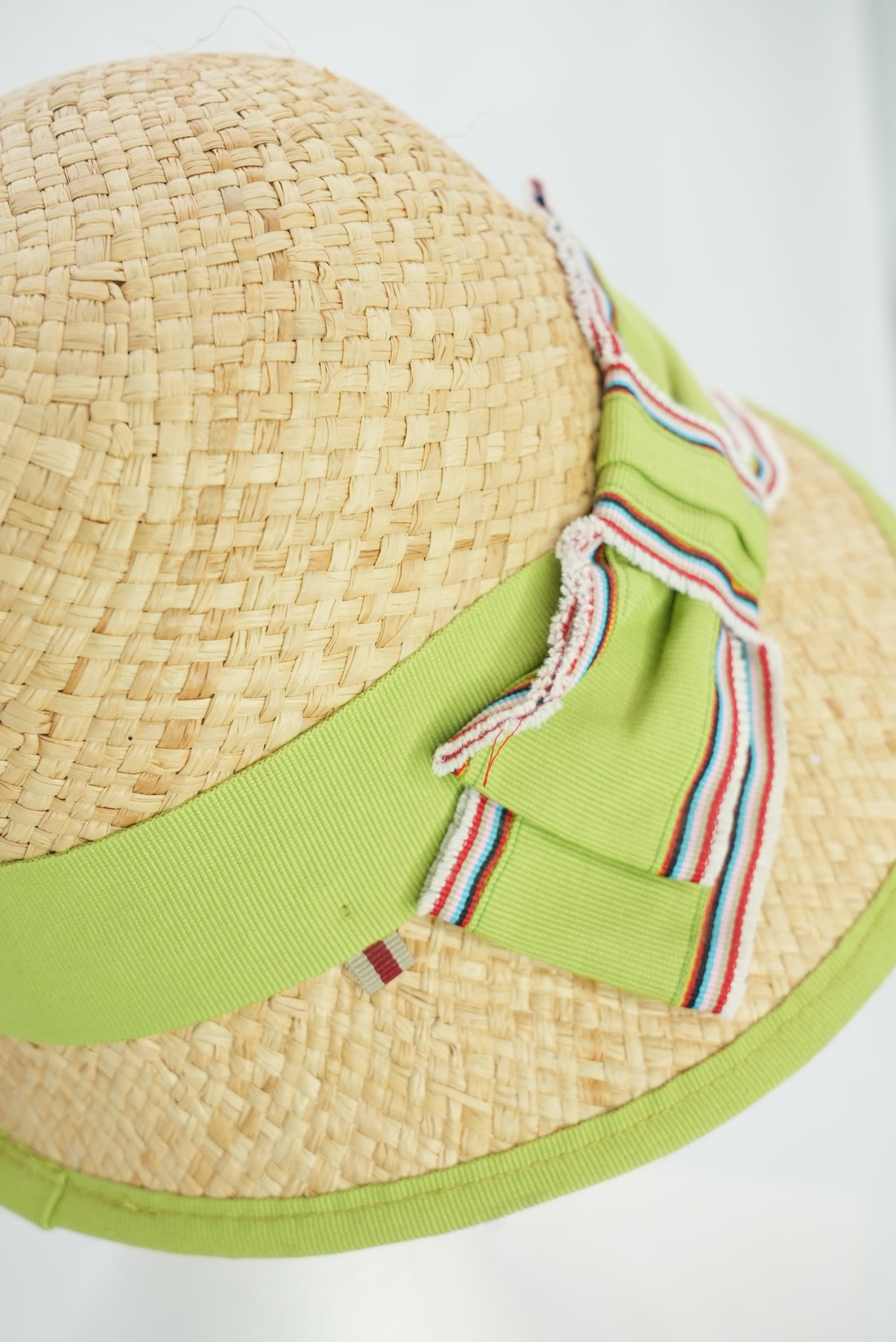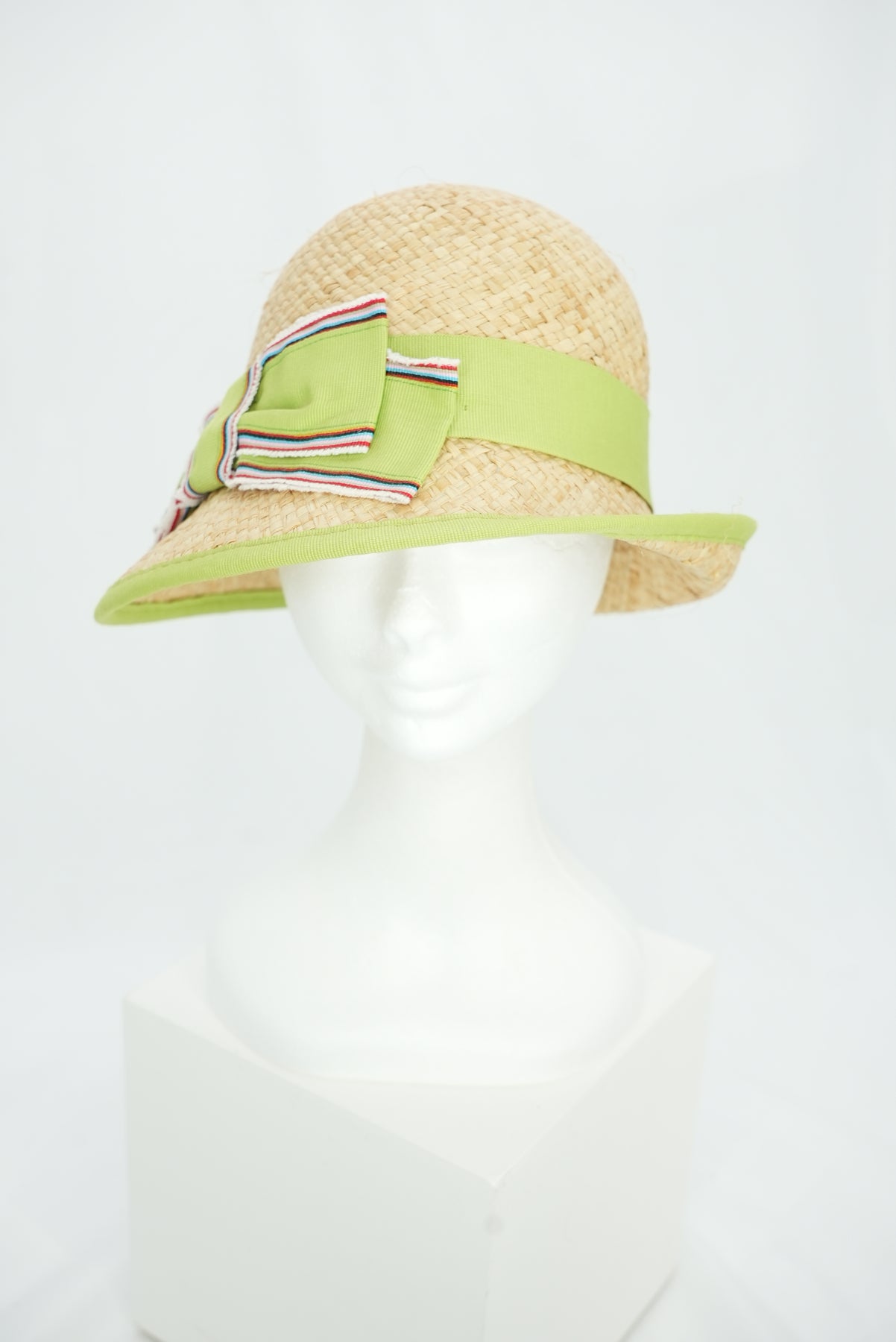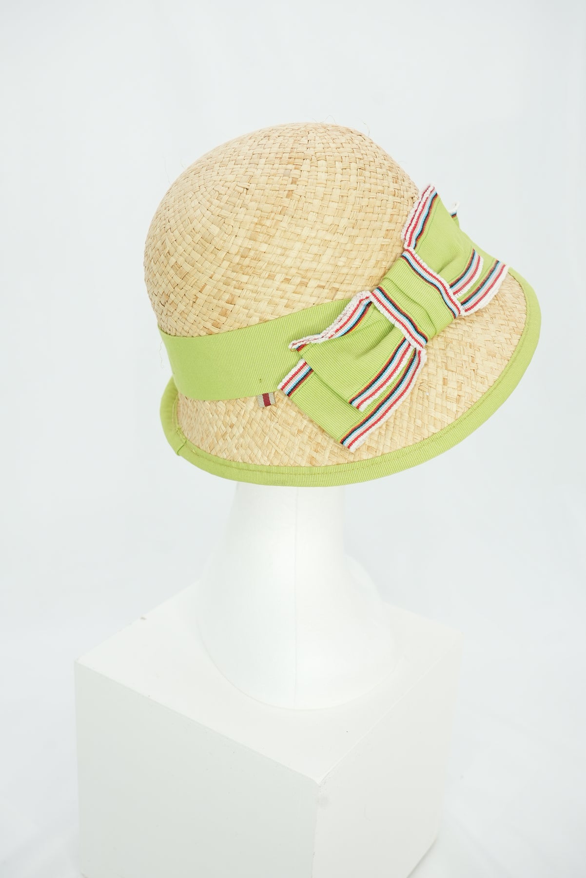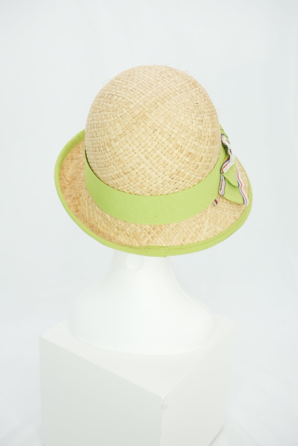 Dieser Glockenstrohhut strahlt feminine Leichtigkeit und sommerliche Frische aus. Die typische Glockenform umspielt das Gesicht sanft und verleiht dem Look eine elegante, verspielte Note. Besonders auffällig ist das hellgrüne Band, das die Hutkrone schmückt und in eine zarte Schleife übergeht. Auch der Rand des Hutes ist in dem gleichen hellen Grün gehalten, was dem Design eine harmonische und frische Einheit verleiht. Ein stilvolles Accessoire, das perfekt zu warmen Tagen und romantischen Outfits passt.
